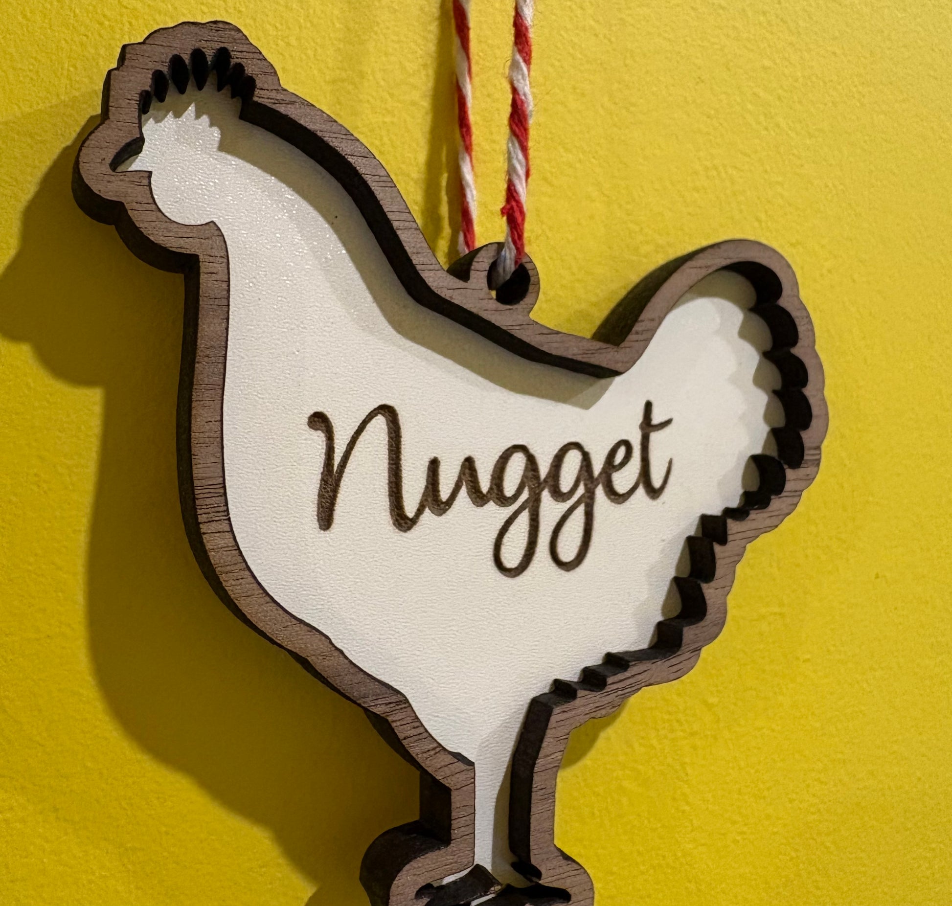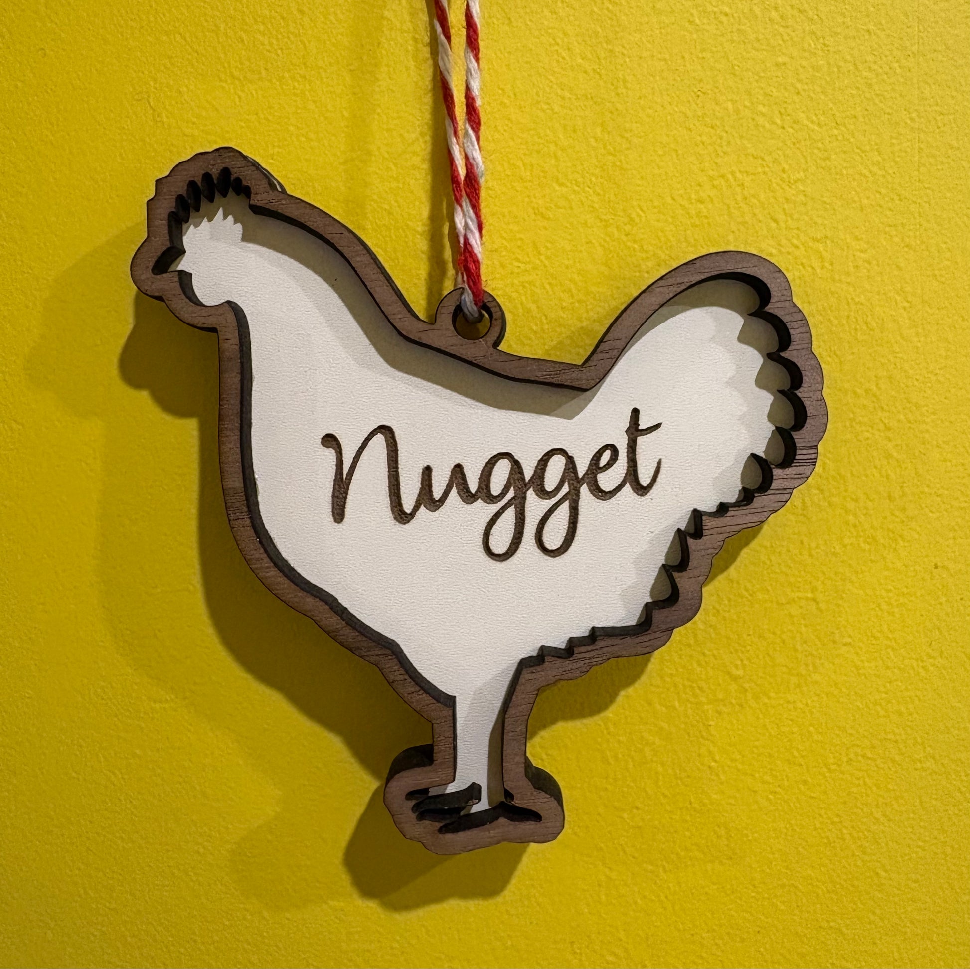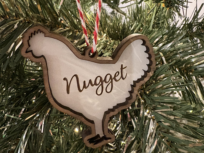 Featuring a charming chicken silhouette, this bauble adds a unique and rustic touch to your Christmas tree. Customize the bauble with your pet's name, making it a special and memorable keepsake for years to come.